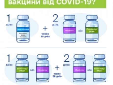 - 1-ша доза – Comirnaty чи Moderna, 2-га – Moderna чи Comirnaty через 28 днів