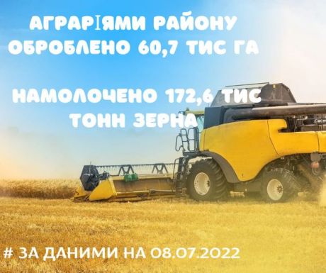 За станом на 8 липня, зібрано зернових та зернобобових культур (без ріпаку) на площі 60,7 тис.га, намолочено 172,6 тис.тонн зерна із середньою урожайністю 28,4 ц/га.