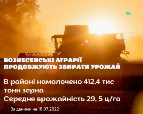 Станом на 18.07.2022 по всіх категоріях господарств зібрано зернових та зернобобових культур (без ріпаку) на площі 139,8 тис.га, що складає 69,7 %, намолочено 412,4 тис.тонн зерна із середньою врожайністю 29,5 ц/га.