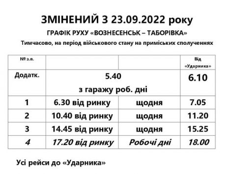 Шановні мешканці району, ОНОВЛЕНО тимчасовий розклад руху громадського транспорту, який діє на період запровадження воєнного стану за маршрутом: