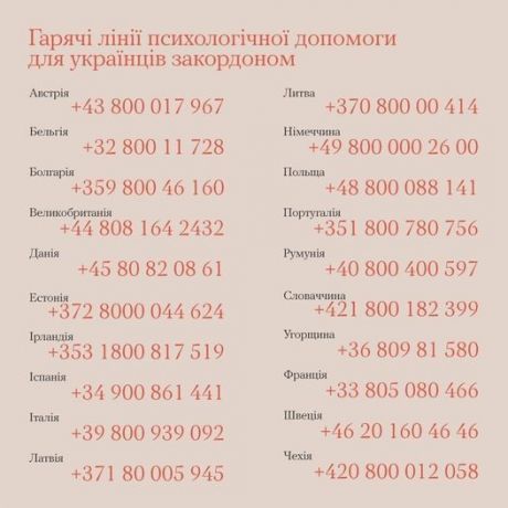 Зберігайте закордонні гарячі лінії психологічної допомоги українцям. За ними вас з'єднають з фахівцями, які надають кризові (і не тільки) консультації, а також можуть спрямувати до інших спеціалістів за необхідності.