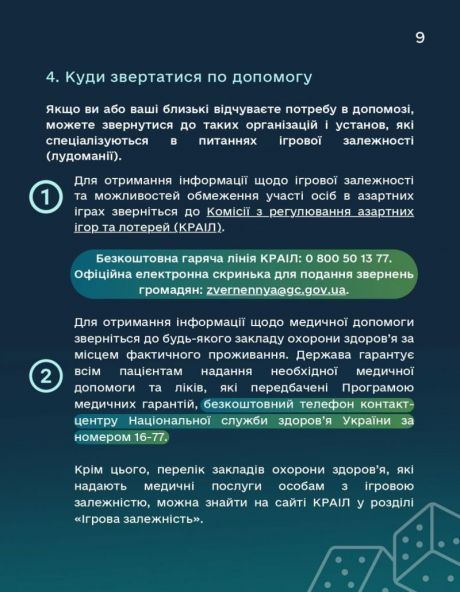 Крім цього, перелік закладів охорони здоров’я, які надають медичні послуги особам з ігровою залежністю, можна знайти на сайті КРАІЛ у розділі «Ігрова залежність».
