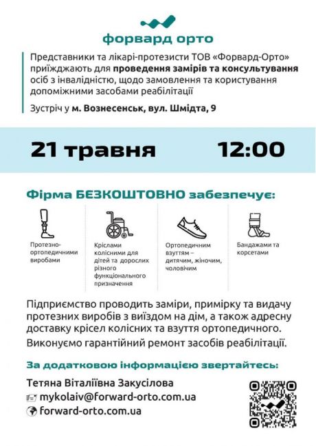 21 травня 2024 року в місті Вознесенськ за адресою вул. Шмідта, 9, з 12.00 будуть працювати представники та лікарі-протезисти ТОВ «Форвард-Орто».