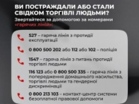 Якщо Ви або Ваші близькі потрапили до рук торгівців людьми, звертайтеся за допомогою за номерами «гарячих ліній»: