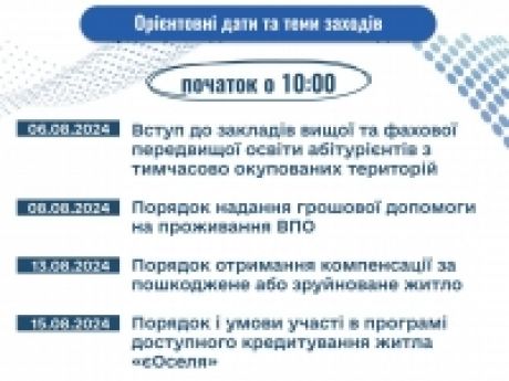 Організатори запрошують ВПО на онлайн-заходи, де представники різних міністерств і Офісу Омбудсмана нададуть відповіді на всі питання які у вас виникають, починаючи від виплати допомоги на проживання, вступу дітей до закладів освіти, постановки на квартирний облік, закінчуючи компенсацією за пошкоджене або зруйноване майно.