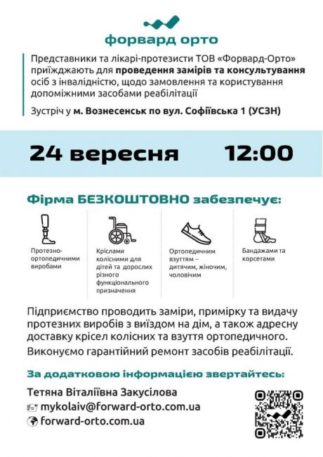 24 вересня 2024 року в місті Вознесенськ за адресою вул. Софіївська, 1, з 12.00 будуть працювати представники та лікарі-протезисти ТОВ « Форвард-Орто».