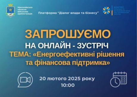 «Діалог влади та бізнесу» триває: Миколаївська обласна державна адміністрація запрошує представників бізнесу, установ та організацій взяти участь в онлайн-зустрічі присвяченій обговоренню енергоефективних рішень та їх фінансової підтримки