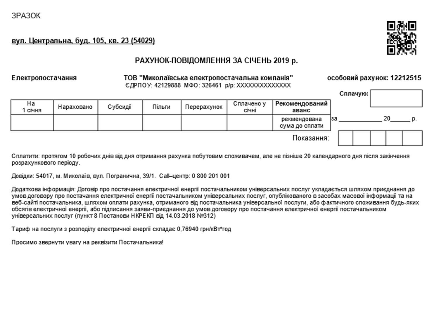 З 20 січня 2019 року побутові споживачі електричної енергії отримають рахунок-повідомлення від ТОВ «Миколаївська електропостачальна компанія» з новим особовим рахунком та з новими реквізитами. У рахунку буде вказано суму рекомендованого авансу за січень 2019 року. При цьому, якщо вартість об'єму Вашого фактичного споживання електроенергії більше або менше суми рекомендованої до оплати, в рахунку-повідомленні передбачена графа «Сплачую" для внесення потрібної суми.