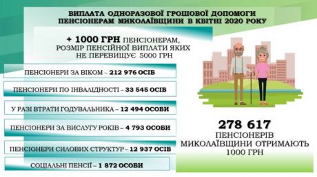 23 квітня 2020 року Головним управління Пенсійного фонду України в Миколаївській області профінансовано виплату одноразової грошової допомоги в розмірі 1000 гривень пенсіонерам, розмір пенсійної виплати яких менше 5000 гривень.