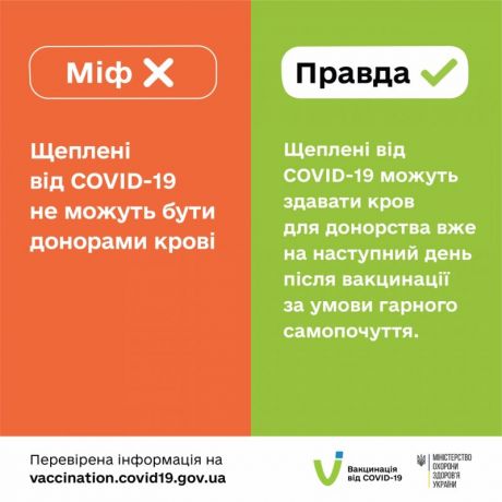 Правда: Щеплення неживими вакцинами, якими є всі наявні в Україні вакцини проти COVID-19, не є протипоказанням до донорства крові.