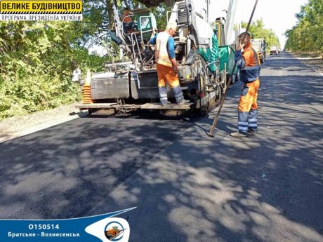 В рамках програми Президента України Володимира Зеленського «Велике Будівництво» продовжуються роботи з поточного середнього ремонту на автомобільній дорозі загального користування місцевого значення О150514 Братське-Вознесенськ, км 9+300 - км 14+300.