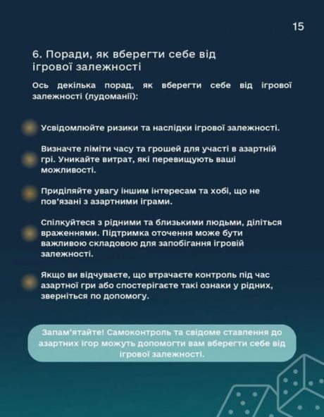 Запам’ятайте! Самоконтроль та свідоме ставлення до азартних ігор можуть допомогти вам вберегти себе від ігрової залежності.