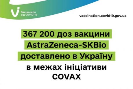 Сьогодні Україна отримала понад 367 200 доз вакцини AstraZeneca-SKBio виробництва Південної Кореї в межах глобальної ініціативи COVAX.