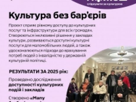 Міністерство культури України реалізує флагманський проєкт «Культура без бар’єрів», спрямований на забезпечення рівного доступу до мистецтва, культурної спадщини та освітніх можливостей для всіх громадян.