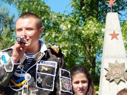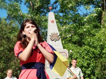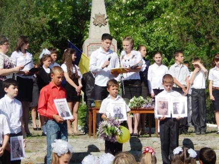 З трепетом у серці правнуки колишніх воїнів притискали до грудей портрети своїх прадідусів і обіцяли берегти пам'ять про них на все життя. Кращі учні школи Смірнова Анастасія та Бутенко Анатолій зачитали імена загиблих односельчан. Сорокін Дмитро, який на передодні свята повернувся з лав української армії,виконав пісню в пам'ять про війну. Як символ миру на землі здійнявся у чисте небо білий голуб під слова пісні «Перемога», яку виконала студентка Надія Лазаренко. І лягли на гранітні плити тюльпани, гвоздики та запашний бузок від вдячних жителів села.