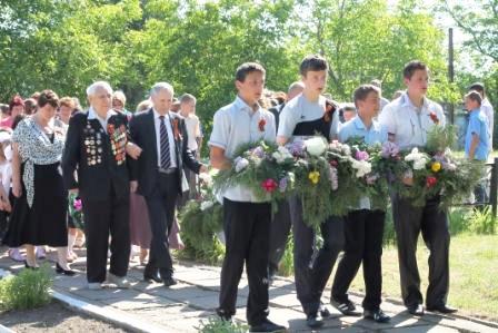 Розпочався мітинг урочистими словами ведучих Батракової Юлії та Степаненко Ольги, які привітали всіх односельців зі святом. До них приєдналися сільський голова Бойко С.Я., голова ветеранської організації Балюк В.Р., директор школи Давидович Л.А.,голова профспілкового комітету ДПДГ « Зорі над Бугом» Степаненко Л.П.,яка крім побажань, подарувала від імені керівника ДПДГ Єлінєвського Ю.Ю.ветеранам цінні подарунки. З особливо теплими словами та найщирішими побажаннями звернувся до всіх депутат районної ради, голова районної ради Бурдін І.А.,який наголосив на тому, що мільйонами жертв заплатив наш народ у битві за Велику Перемогу, стільки втрат, горя та біди принесла людям війна, і з якою радістю сьогодні , в 68 раз ,ми зустрічаємо це свято. Зі словами вдячності звернувся Іван Арсентійович до наших ветеранів, побажавши їм міцного здоров'я, витримки , побільше радості у життя, аби ще довгі роки вони могли радувати нас своєю присутністю на святі, адже саме вони є прикладом стійкості, витривалості, самовідданості та патріотизму. І сьогодні наша держава приділяє неабияку увагу людям, які пройшлися страшними дорогами війни, які карбували Перемогу і розбудовували країну. Іван Асентійович звернувся до присутніх зі словами про те, що наше покоління у довічному боргу перед цими людьми , груди яких вкриті орденами та медалями,а серця шрамами від втрат. Долучилися до привітань і школярі ,члени « Соколиної республіки», які під керівництвом свого наставника Петрушкової О.М. організували почесну варту біля пам’ятника загиблим воїнам під час Великої Вітчизняної війни та пам'ятника евреям, загинувших на території села від рук нацистів. Багато добрих та щирих слів пролунало на адресу ветеранів із вуст школярів, а крім того, члени пошукового загону разом зі своїм наставником подарували Кіму Б.М. нарис « Крізь призму життя», в якому описали його життєвий та воєнний шлях, занотували спогади .Здавалось, Борис Михайлович радів, як дитина, а в очах Олени Миколаївни світилася гордість за своїх вихованців.