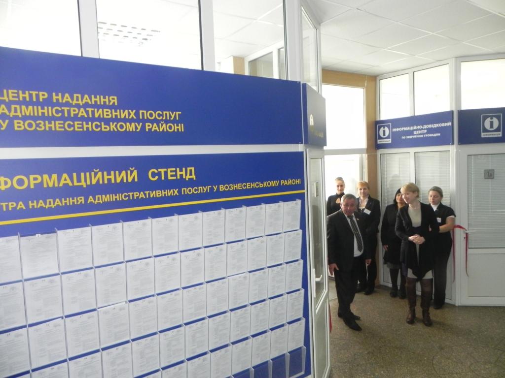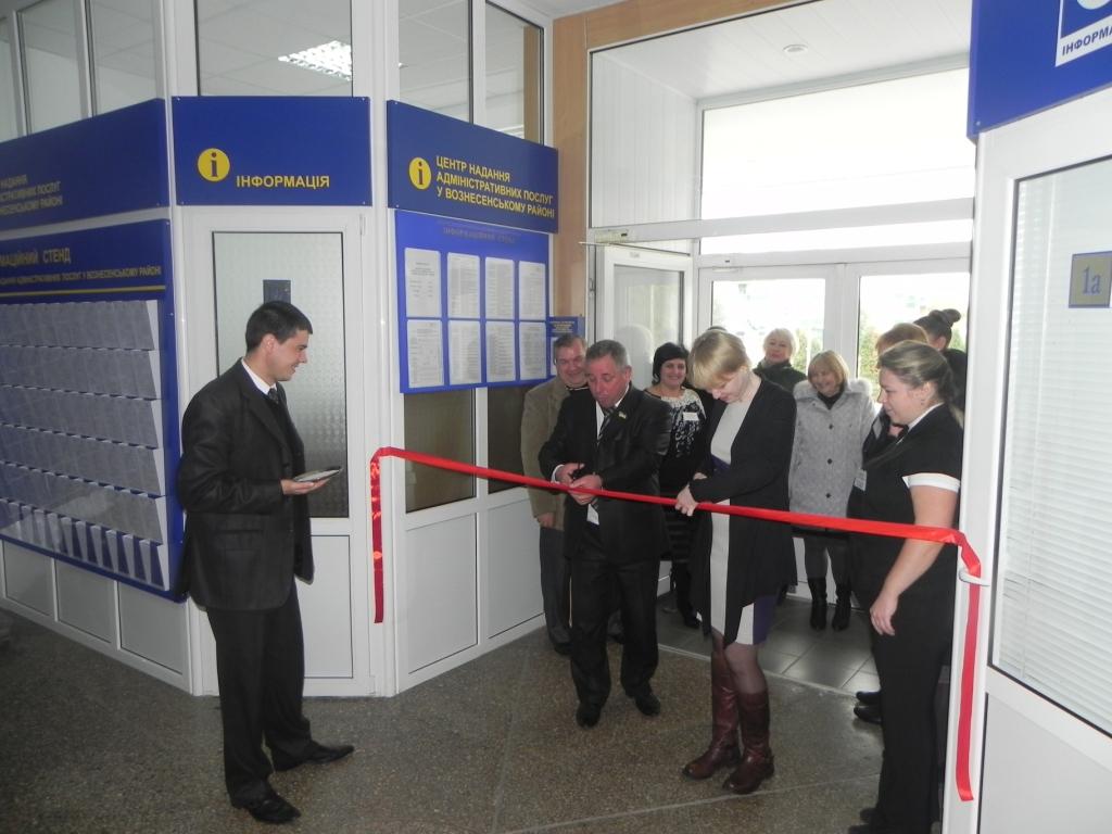11 жовтня 2013 року відбулось урочисте відкриття Центру надання адміністративних послуг у Вознесенському районі. У відкритті Центру взяли участь голова Вознесенської райдержадміністрації Кучер Олександр Борисович, начальник відділу державних адміністраторів та забезпечення їх діяльності Миколаївської облдержадміністрації Мураховська Людмила Петрівна, керівник апарату Вознесенської райдержадміністрації Торопін Олександр Олександрович, представники структурних підрозділів райдержадміністрації, які будуть брати участь у роботі Центру.
