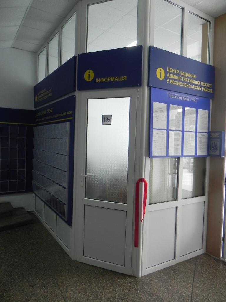 Центр надання адміністративних послуг розміщено на І поверсі Вознесенської райдержадміністрації, за адресою: м. Вознесенськ, пл. Центральна, 1.