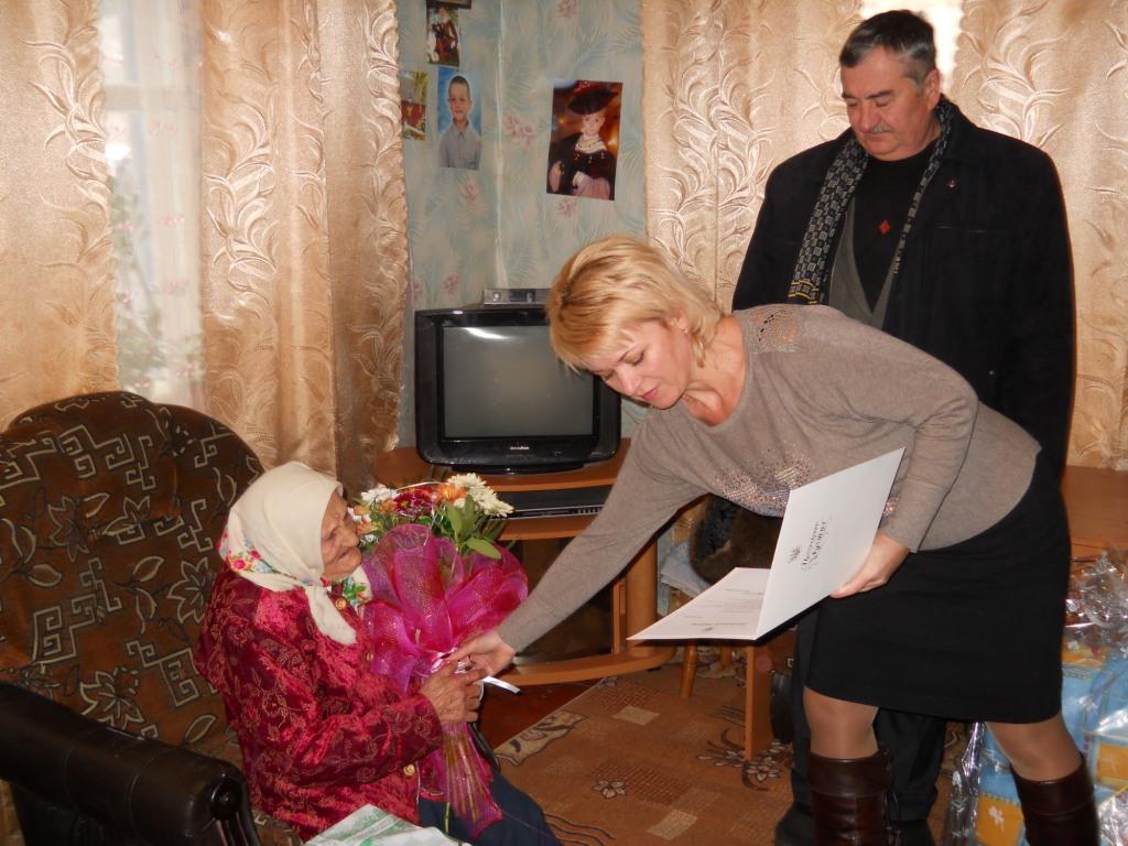 Вітальну листівку, квіти та подарунок ювілярці від Президента України В.Ф. Януковича вручила начальник управління соціального захисту населення Вознесенської державної адміністрації А.В.Житник. З теплими привітаннями, побажаннями здоров’я і довголіття та подарунками до Лукерії Кирилівни завітали: директор територіального центру соціального обслуговування (надання соціальних послуг) Вознесенського району Н.Ю. Наконечна, голова Вознесенської сільської ради Земляний Є.О.. Начальник управління соціального захисту населення Вознесенської райдержадміністрації А.В. Житник привітала довгожительку та вручила Л.К. Лазовій "Сертифікат на отримання довічної стипендії".