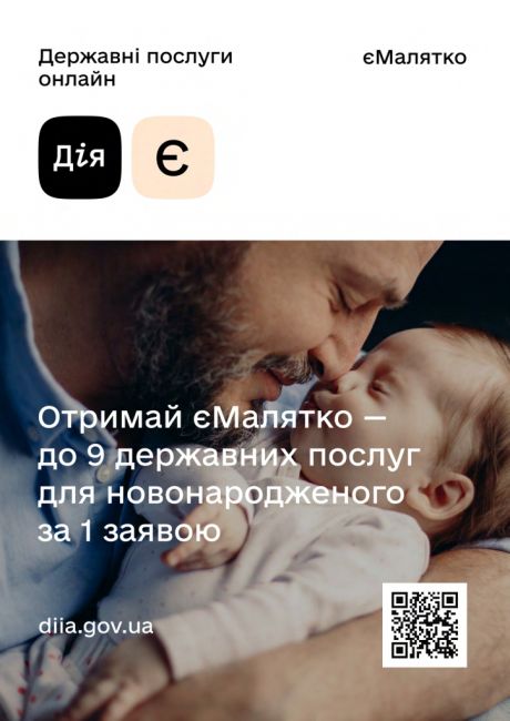 єМалятко — комплексна послуга для батьків новонароджених. За однією заявою, поданою онлайн, можна зареєструвати народження дитини та отримати до 9-ти державних послуг від різних органів влади, потрібних при народженні дитини.